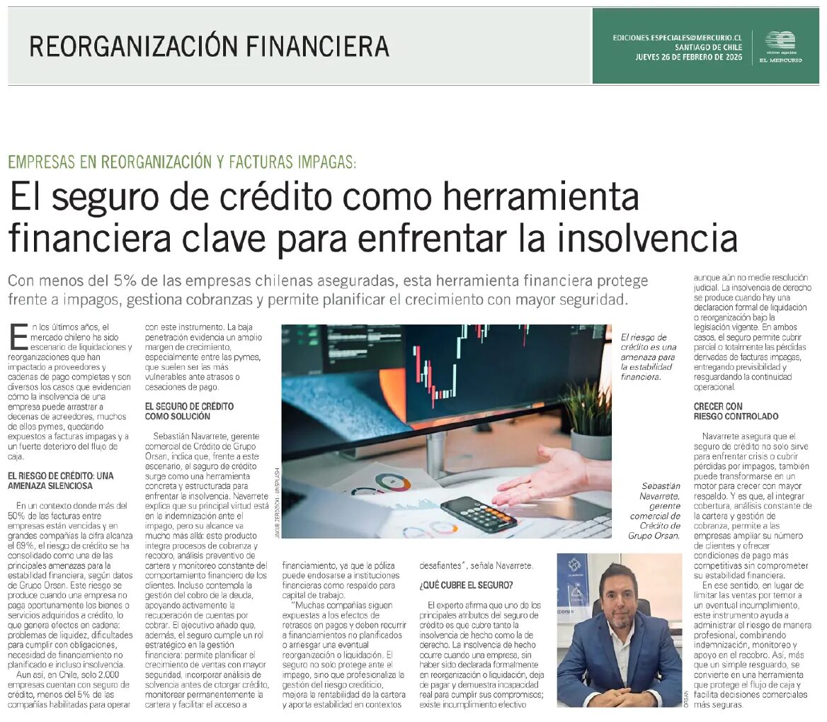 Sebastián Navarrete Levin, nuestro Gerente de Seguro de Crédito, habla en El Mercurio de los beneficios de esta póliza ORSAN Seguros.👌